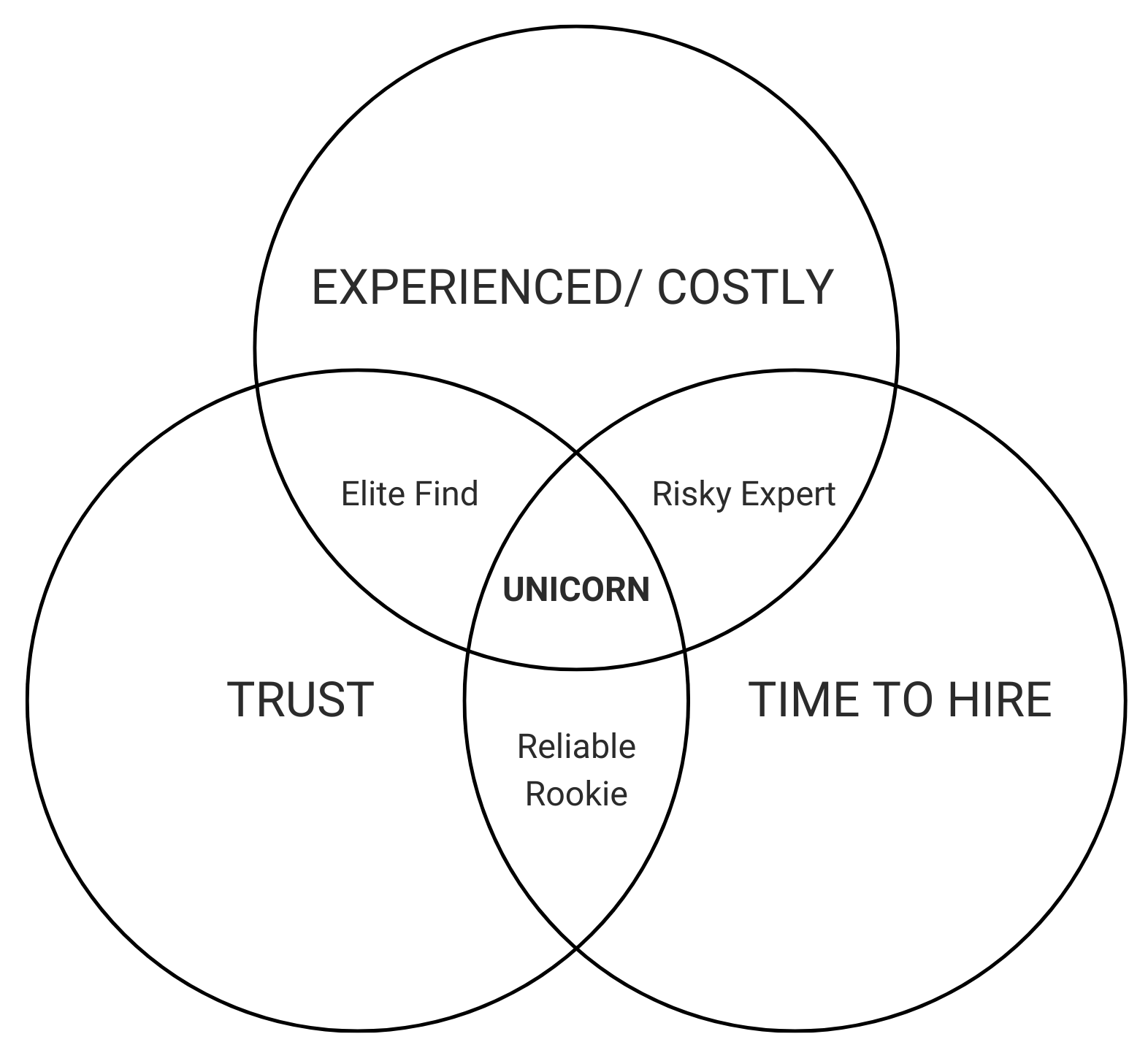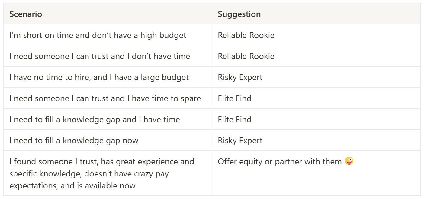 We end up with four types of candidates. Unicorns don’t exist (and if you come across one, you should partner with them, not hire them) so we’re left off with three personas. Different situations require different personas. There’s the general rule of build with generalists and scale with specialists, but I think that’s a simple view of approaching a complex task like scaling a company. Anecdotally, my experience sways towards Reliable Rookies or Elite Finds, that probably highlights my preference to over index on trust and trust building in general (which we’ll get to in the coming posts).